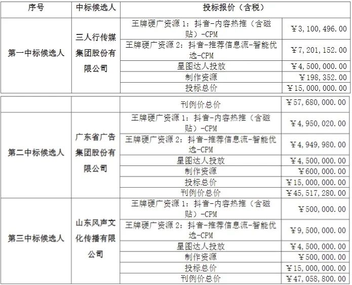结果也在预料之中,根据公示,三家公司的投标总价都是1500万元。对于这么大体量的公司来说真不算多。在抖音上投放1500万,